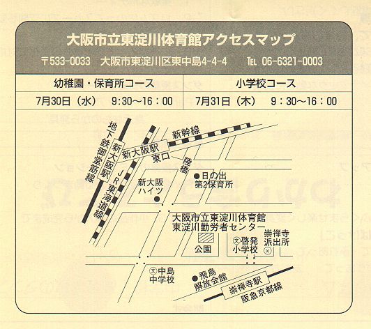 | 場所 | 大阪市立東淀川体育館 JR新大阪東口より南東徒歩5分 地下鉄御堂筋線新大阪より南東徒歩10分 阪急京都線崇禅寺駅より北西徒歩5分 大阪市立東淀川体育館アクセスマップは こちらをクリック! |