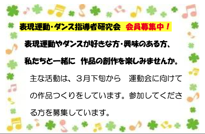 運動会の表現・ダンス作品の作成を中心に活動しています。一緒に表現運動や体動かしを楽しみませんか。会の活動にご興味のある方のご連絡をお待ちしています。